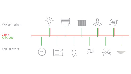 KNX-system liknar ett fint nervsystem utrustat med sensorer och aktorer. Allt som sensorerna uppfattar vidarebefordras som kommandon till aktorerna, som i sin tur skapar den önskade funktionen: De tänder ljuset när det blir för mörkt, de värmer när det blir för kallt, de styr persiennerna när solen bländar. Topologin är extremt flexibel: linje-, träd- eller till och med stjärnstrukturer är möjliga.
